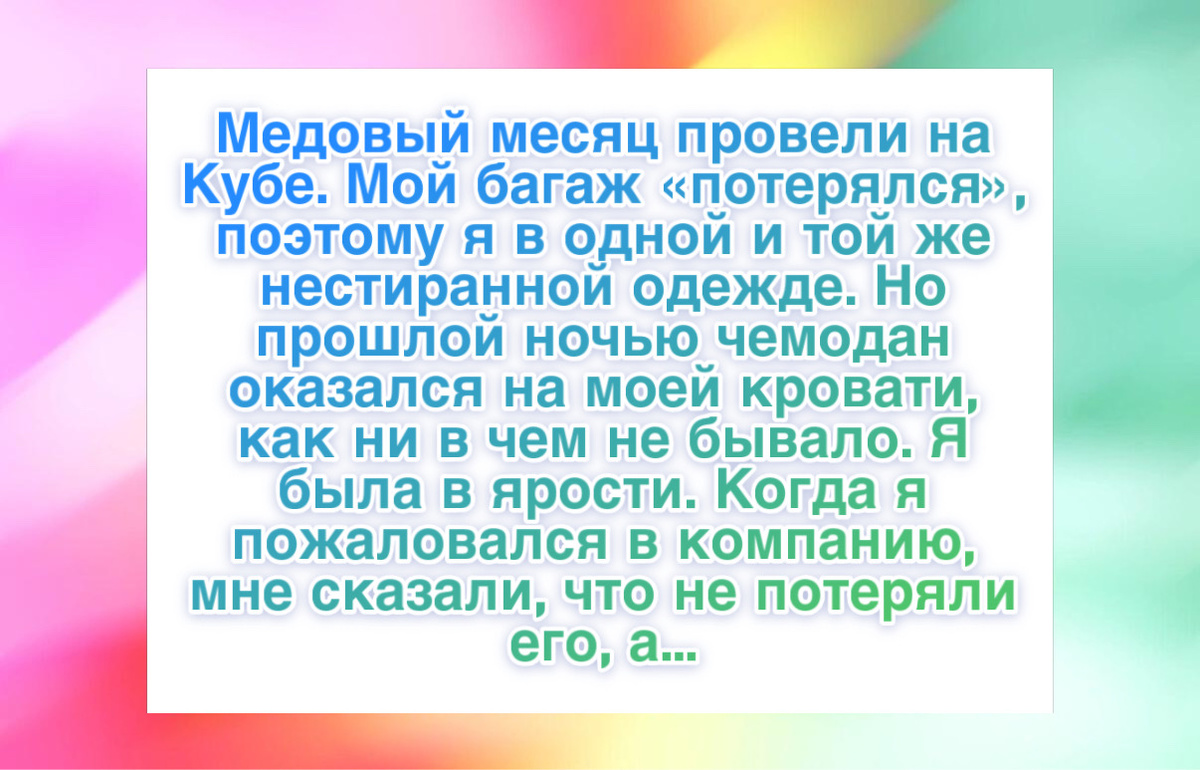 “Мы поехали с женой в свадебное путешествие на круиз на Кубу. Все было бы отлично, если бы они не потеряли мой багаж. У меня были только одни шорты, носки и футболка. Весь отпуск я ездил по тропическим островам в одном и том же, и это было отвратительно. В последний вечер возвращаюсь в каюту и вижу свой чемодан на кровати. Оказалось, его не теряли, просто человек из каюты напротив забрал его, потому что подумал, что это чемодан его друга.”