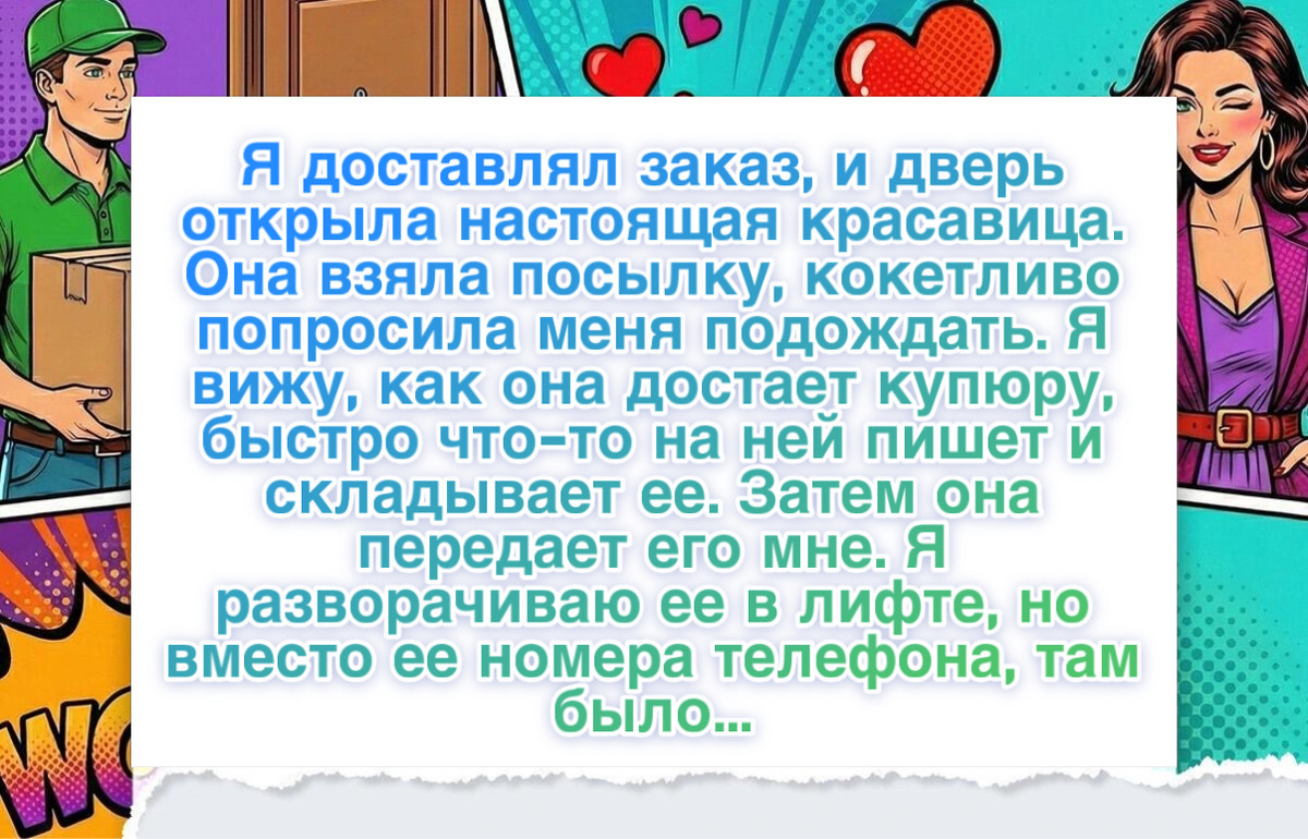 “Однажды в заказе была пометка доставить строго после шести вечера, а я приехал около пяти. Открывает дверь мужчина с круглыми глазами, а на фоне женский голос говорит, что наверное ошиблись дверью. Потом я понял, что муж у нее очень ревнивый, поэтому она специально заказывала доставку на время, когда его нет дома.”