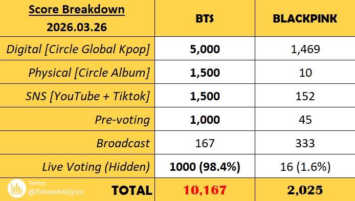 🔮 "Swim" на данный момент является песней с самым высоким рейтингом в M Countdown в 2026 году, набрав 10 167 баллов
