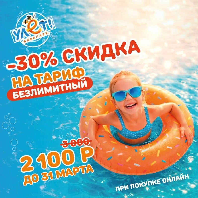 ☀️ Весна уже здесь, а в «Улёте» — настоящее лето круглый год. И мы дарим вам шанс провести целый день в аквапарке с максимальной выгодой. 🎫 Безлимитный билет — 2100 ₽ вместо 3000 ₽ −30% на весь день без ограничений. Что вас ждёт: · Волны, которые уносят заботы · Горки, где смех слышен до вечера · Термозона и джакузи для полного расслабления · Время, которое хочется делить с близкими Билет можно купить до 31 марта, а использовать в любой день апреля — для гостей от 5 лет. Не суммируется с другими акциями. Приезжайте заряжаться весной и солнечным настроением. В «Улёте» лето уже началось! 🎟билеты на сайте promo.aquaulet.ru 🌐 Наш канал в MAX: https://max.ru/id7300032246_biz 📍Аквапарк «Улёт», ул. Александровская, 60В #Улёт #Аквапарк #ЛетоКруглыйГод #Безлимит #Скидка #ПланыНаАпрель