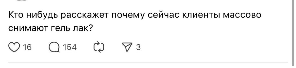 💭 Там обсуждали, что клиенты массово снимают гель-лак. Я, если честно, не уверена, что это прям массово. Скорее сейчас это активно популяризируется и поэтому постоянно попадается в поле зрения. Гель-лак как делали, так и делают, и у многих с ним все отлично. Но то, что людей, которые его снимают, стало заметно больше, это да. И причины у них обычно не из серии тренд,а очень бытовые. Запись, дорога, два часа на маник, переносы. Потом проходит неделя и уже видно отрастание, у кого-то быстро стираются торцы, у кого-то через пару дней снова появляется бахрома, у кого-то начинаются отслойки. И многих это реально бесит, помню это по своему опыту. Плюс качество. Пропилы, порезы, боль после снятия, волны на пластине. В какой-то момент многим просто не хочется больше участвовать в этой лотерее. Даже если мастер хороший, даже если в этот раз нормально, усталость копится от самого формата. И дальше начинается самое интересное. Снять покрытие легко. Сложнее привыкнуть к тому, что руки теперь
