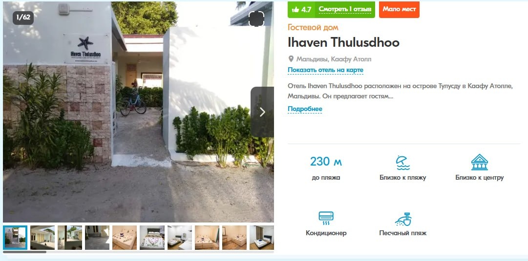 ). https://trvl.click/x/SXMFp ℹ️ Что входит в стоимость: Перелет, проживание, трансфер, страховка. Питание Завтрак. ▫️ Ihaven Thulusdhoo Гостевой дом до пляжа 230 м., Каафу Атолл, 8 ночей, Завтрак, прямой чартерный. Вылет 9 апреля, 103 450 руб/чел (за двух взрослых 206 900) https://trvl.click/x/DQNOB ▫️ Ocean Retreat & Spa Гостевой дом до пляжа 270 м., Каафу Атолл, 8 ночей, Завтрак, прямой чартерный. Вылет 9 апреля, 107 150 руб/чел (за двух взрослых 214 300) https://trvl.click/x/NVlQo ▫️ Nest By Hawks 2* до пляжа 350 м., Баа Атолл, 8 ночей, Завтрак, прямой чартерный. Вылет 9 апреля, 109 550 руб/чел (за двух взрослых 219 100) https://trvl.click/x/RMBTs Все туры (цена будет указана за двух взрослых) https://trvl.click/x/SXMFp По ссылкам цена указана за двух взрослых. Вы можете изменить город вылета и количество человек, цена обновится автоматически. Промокоды для скидки KLIK1100 от 60000 рублей, скидка 1100 рублей KLIK2000 от 100000 рублей, скидка 2000 рублей KLIK4000 от 200000 ру