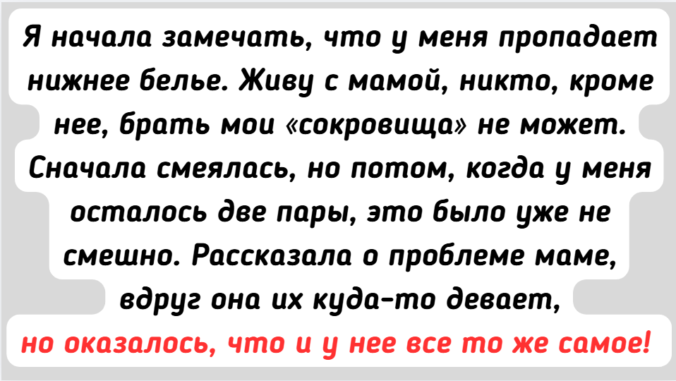 - Я начала замечать, что у меня пропадает нижнее белье. Живу с мамой, никто, кроме нее, брать мои «сокровища» не может. Сначала смеялась, но потом, когда у меня осталось две пары, это было уже не смешно. Рассказала о проблеме маме, вдруг она их куда-то девает, но оказалось, что и у нее все то же самое! Начали исследовать всю квартиру, наткнулись на «воришку», который волчьей походкой тащил мою предпоследнюю пару под диван. Поймали нашего кота на горячем! Оказалось, что он целый склад нижнего белья под диваном устроил!