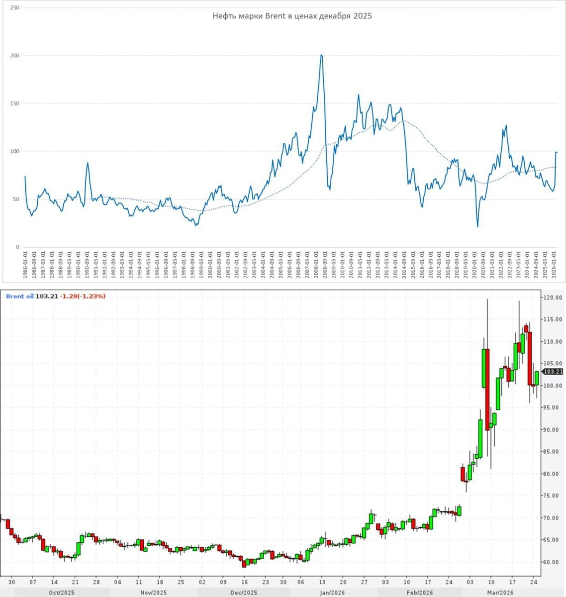 МИД и официальные СМИ заявили, что «никаких прямых или косвенных контактов нет», а требования США «нереалистичны и чрезмерны». Иран повторил свои условия прекращение ударов, компенсации, признание суверенитета над Ормузом. Ормузский пролив остаётся закрытым (трафик минимальный, сотни танкеров на якоре). Но Иран заявил о том, что готов согласовано пропускать суда Китая, Индии и России, что может несколько сгладить дефицит с поставками. По данным Bloomberg Индия закупает 60 mb у России с премией $5-15 к Brent с поставкой в апреле, отказывается от оплат в долларах. Средняя цена Brent >$97 в моменте снова выше $100 за баррель. При таких ценах на FOB будет $85-100 за баррель (в последнюю неделю было $85-90), но выручка скорее придет ближе к концу апреля-маю. В целом ситуация немного стабилизировалась на текущих уровнях, но с рисками скорее в сторону эскалации. Если смотреть цену на нефть в реальном выражении — то цены, конечно, повышенные, но не радикально. https://smart-lab.ru/mobile/t