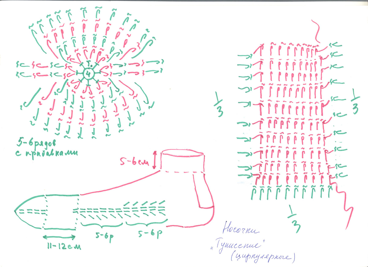 С третьего ряда вяжите по схеме с прибавками, пять - шесть рядов. Продолжите вязание без прибавок 11 -12 см. Далее делайте со стороны подошвы пять - шесть рядов, затем ещё пять - шесть рядов с прибавками со стороны подъёма. Вывязывать пятку нужно нитью "А". Разделите пятку на три части. Наберите петли на правой вертикали и на средней горизонтали. Вяжите ряды на средней части пятки, набирая петли захватывайте петлю на лев