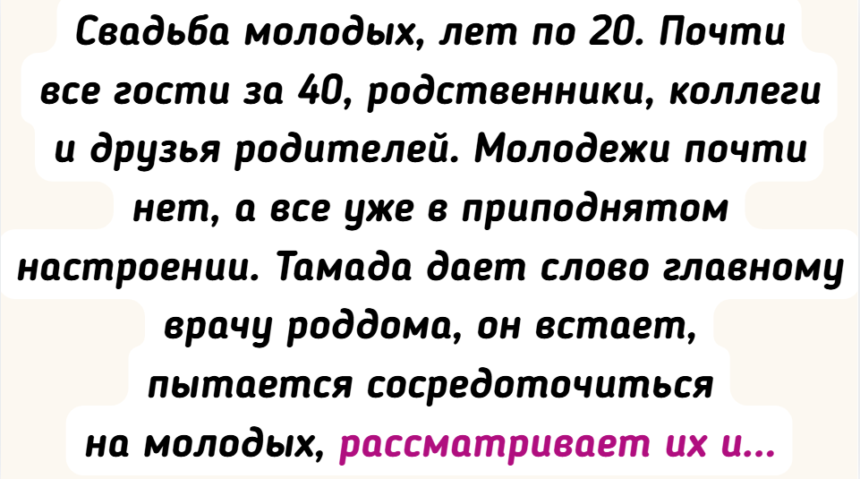 - Свадьба молодых, лет по 20. Почти все гости за 40, родственники, коллеги и друзья родителей. Молодежи почти нет, а все уже в приподнятом настроении. Тамада дает слово главному врачу роддома, он встает, пытается сосредоточиться на молодых, рассматривает их и наконец произносит одно слово: «Жду!» Свадьба буквально разрывалась от смеха. © Thestuntman