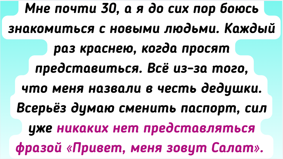 - Мне почти 30, а я до сих пор боюсь знакомиться с новыми людьми. Каждый раз краснею, когда просят представиться. Всё из-за того, что меня назвали в честь дедушки. Всерьёз думаю сменить паспорт, сил уже никаких нет представляться фразой «Привет, меня зовут Салат». Какое впечатление я начинаю производить после этого? Родители против смены имени, даже говорят, что перестанут общаться, да и родственники тоже. Мол, твоего дедушку звали так, ты должен гордо носить это имя, ведь тебя назвали в честь него! Спасибо, но почему-то у них нормальные имена. © user9162161