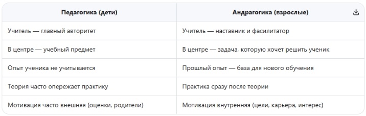 — научно обоснованная система принципов и методов обучения взрослых, учитывающая их когнитивные особенности, мотивацию и жизненный опыт. Если говорить совсем просто: это подход, который помогает взрослым учиться эффективно, с учётом их опыта, мотивации и жизненных целей.