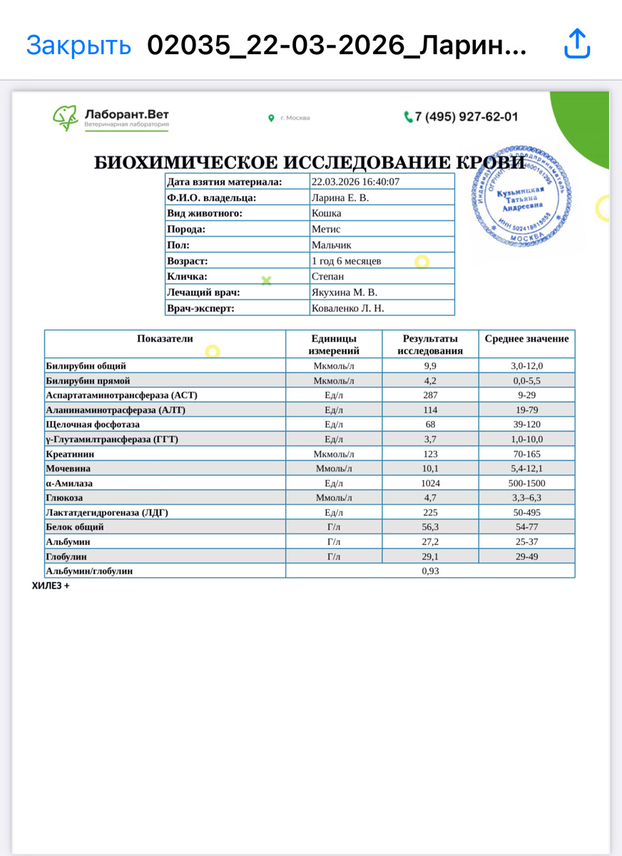 По анализам у Степана завышены печеночные показатели, а по вирусам ФиП подтвердился. Сегодня 5 укол gs. Значит правильно начали колоть его. Но состояние сегодня хуже, сам есть отказался и лежит. Я все ждала улучшения на уколах, но почему-то стало хуже. Степан получает капельницы для печени три дня. Не знаю что ждать дальше, пока что-то все грустно. Не знаю что еще можно сделать