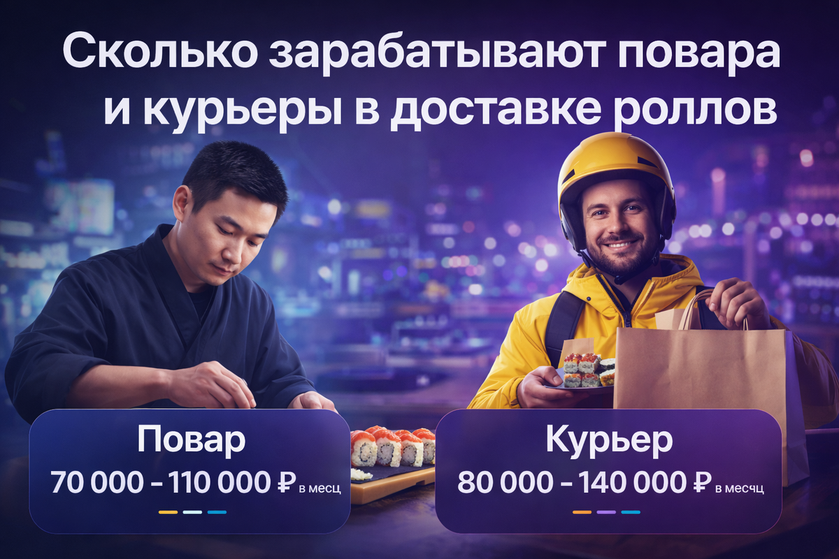 какие зарплаты сейчас в этом бизнесе? Разберём на примере доставки роллов. В доставках роллов повара обычно получают фиксированную ставку за смену. В среднем по рынку: • 3 000 – 5 000 ₽ за смену