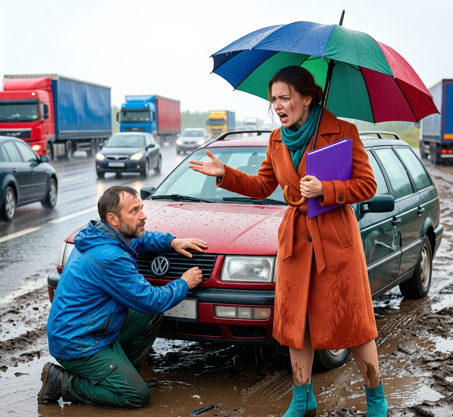 Дождь лил так, словно природа решила смыть трассу «Скандинавия» вместе со всеми машинами. Инга стояла на раскисшей обочине, пытаясь удержать над головой выворачивающийся зонт. Светлый кашемировый тренч намок и отяжелел, а замшевые ботильоны безнадежно увязли в слякоти.