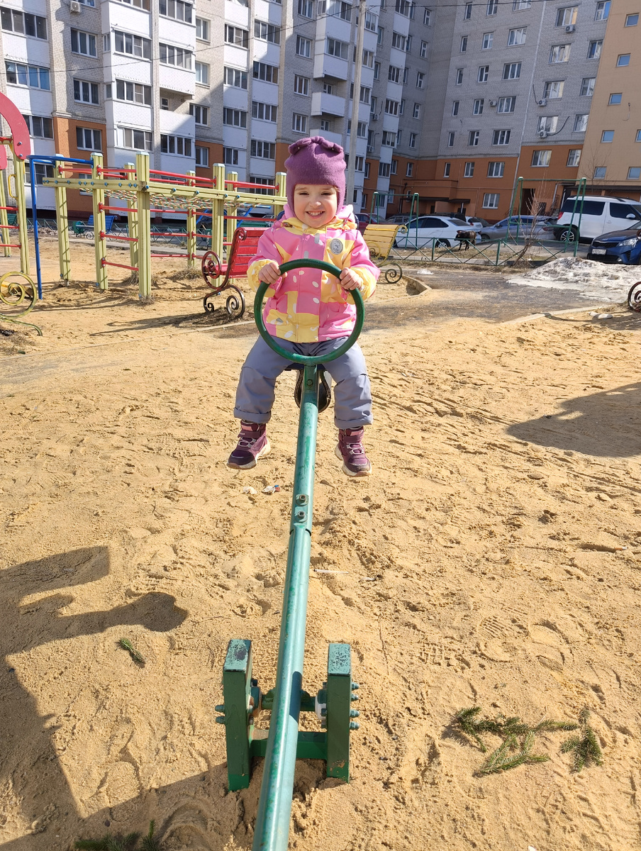 Мы с малышами все утро провели на детской площадке. Классная во дворе площадка. Очень много всяких сооружений, песочек везде. Снег растаял. Только около одной горки было сыро и грязно. Нам хватило развлечений и без нее.