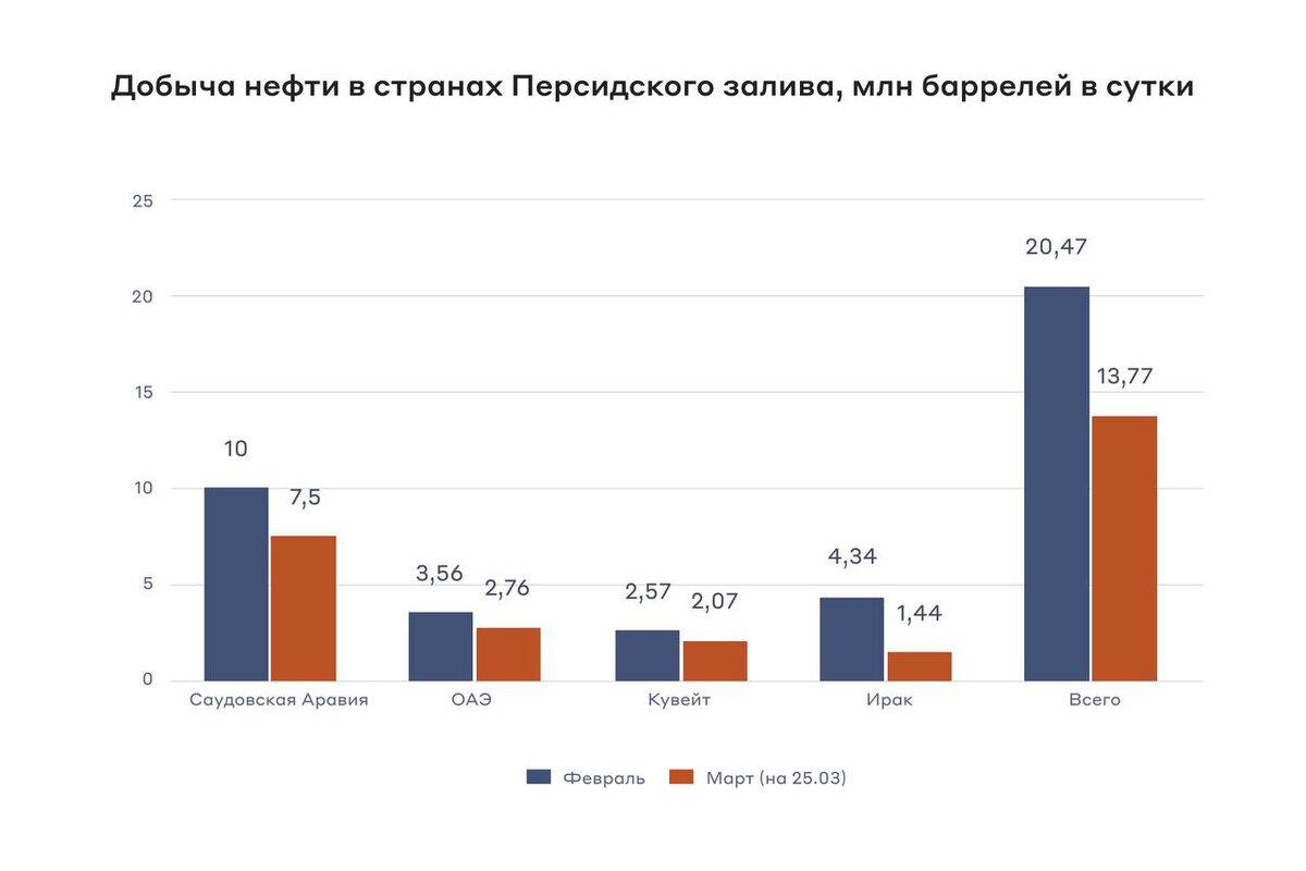 События на Ближнем Востоке уже привели к резкому снижению добычи нефти и сбоям логистики. Главный вопрос в том, как быстро система сможет восстановиться. 📌Снижение добычи По данным Bloomberg, добыча нефти снизилась с 20,47 млн баррелей в сутки в феврале до текущих 13,8 млн. Это влияет на рынок углеводородов и на смежные отрасли, включая производство удобрений. Даже при быстром прекращении конфликта: ⚪️потребуется увеличить добычу почти на 48%, чтобы вернуться к прежним уровням; ⚪️восстановление займёт от нескольких недель до месяцев. Сложность заключается в состоянии инфраструктуры: на некоторых месторождениях мощности снижены, а часть скважин полностью остановлена. Дополнительным фактором остаётся переработка нефти. По данным Reuters, по меньшей мере 40 объектов энергетического сектора в девяти странах Ближнего Востока получили серьёзные повреждения. Это потребует времени на ремонт и последующий ввод в эксплуатацию. 📌Проблемы с логистикой Из более чем 20 млн баррелей в сутки