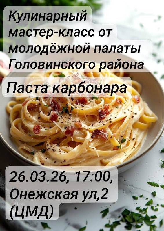! Время: Чт, 17:00 (26.03.26) - сегодня Место: ЦМД (Онежская, 2) Что готовим: паста карбонара Будем рады каждому!