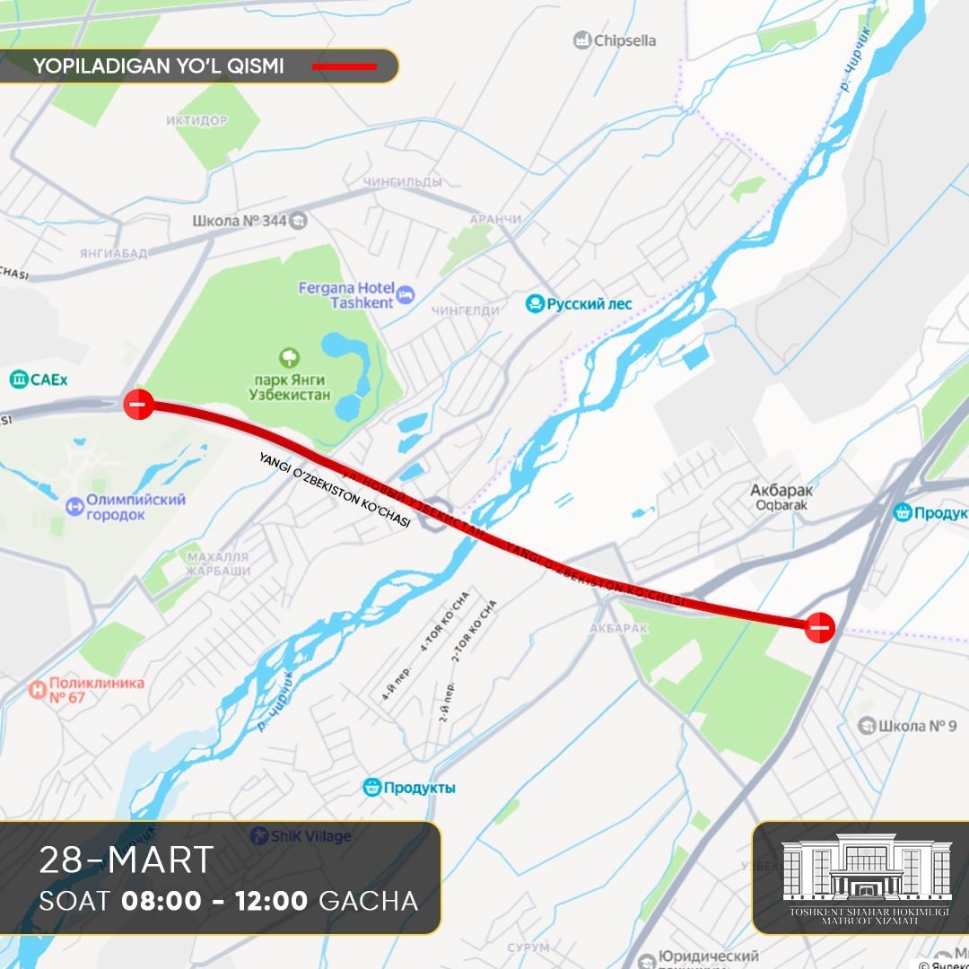 Poytaxtda duatlon bo‘yicha O‘zbekiston chempionati hamda “International Tashkent Marathon — 2026” tadbirlari o‘tkazilishi munosabati bilan xaritada ko‘rsatilgan ko‘chalarda transport vositalari harakati vaqtincha cheklanadi. Haydovchilardan ushbu cheklovlarni inobatga olib, harakat yo‘nalishlarini oldindan rejalashtirish so‘raldi. @daryolive
