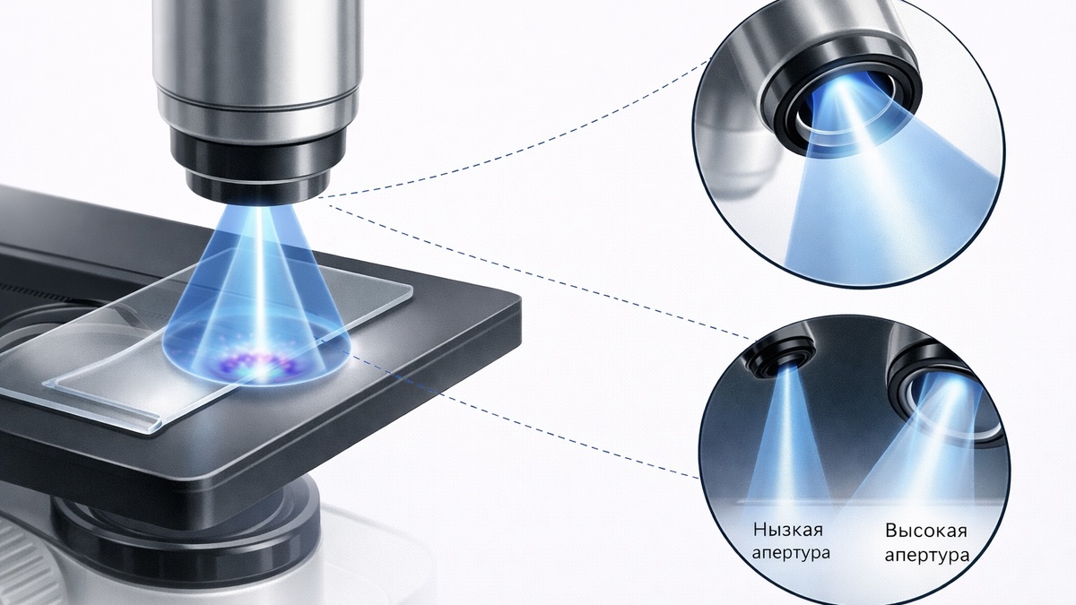 Числовая апертура (NA — Numerical Aperture) — безразмерная характеристика объектива микроскопа, которая описывает, насколько широкий конус света способен принять объектив. Именно числовая апертура определяет разрешающую способность и светосилу микроскопного объектива. NA = n × sin(α), где: Максимально возможная числовая апертура в воздухе — NA = 1,0. С иммерсионным маслом NA может достигать 1,4–1,45. Разрешение микроскопа по формуле Аббе: d = λ / (2 × NA). Объектив с NA=1,25 даёт разрешение около 200 нм при зелёном свете (λ=550 нм), что позволяет видеть крупные вирусы, митохондрии и детали строения клеток. Объектив с NA=0,25 разрешает лишь 1100 нм — только крупные клетки. Числовая апертура всегда указана на корпусе объектива. Например, маркировка «40/0,65» означает: увеличение 40×, числовая апертура 0,65. «100/1,25 Oil» означает: 100×, NA=1,25, иммерсионный. Два объектива с одинаковым увеличением могут иметь разную NA. Например, объектив 40×/0,65 и 40×/0,95 Plan-Apochromat — оба дают 4