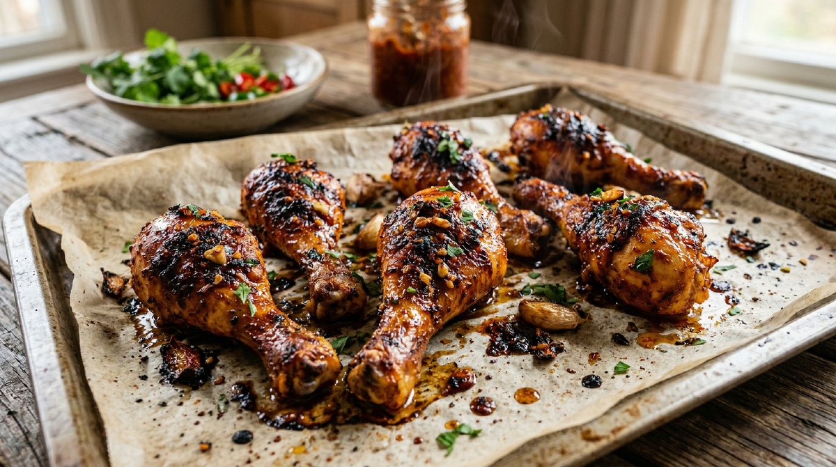 Куриные голени в аджике — это рецепт, ради которого не нужно ехать в специальный магазин за редкими ингредиентами, не нужно проводить полдня на кухне и не нужно обладать поварским образованием. Десять минут на подготовку, четыре часа на маринование (в это время можно заниматься своими делами), сорок минут в духовке — и на столе блюдо, которое выглядит эффектно, пахнет умопомрачительно и на вкус попадает ровно в ту точку, где встречаются хруст, сочность и пикантная острота.
