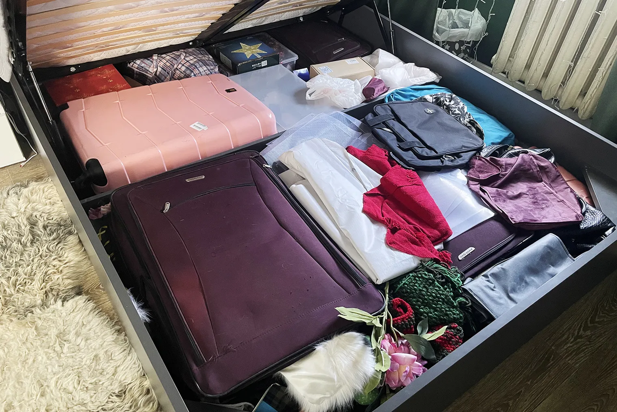 Заглянем под мою кровать. Снаружи все вроде бы неплохо: в основном вещи лежат не в куче, а в чемоданах, из-за чего возникает иллюзия порядка. Но внутри дорожных сумок — бардак. Некоторые не застегнуты на молнию, и вещи просто торчат наружу.