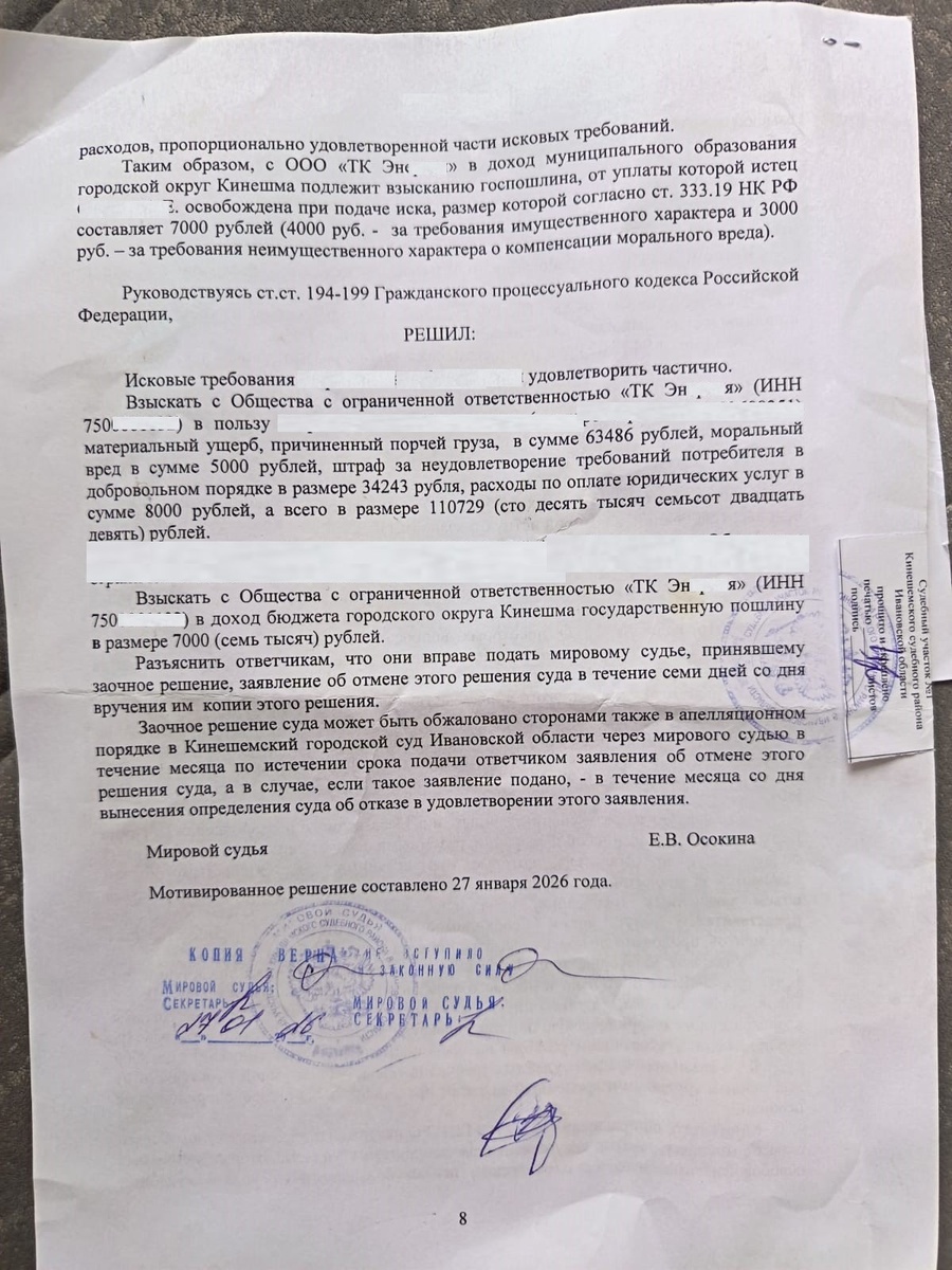 — «не доказано» 👉 В итоге — иск к транспортной компании и суд по порче груза. 📄 Важно: это не наше мнение — это установлено судом. «Взыскать … материальный ущерб, причинённый порчей груза, в сумме 63 486 рублей, моральный вред 5 000 рублей, штраф … 34 243 рубля, расходы на юридические услуги … всего 110 729 рублей» 👉 Ключевое: