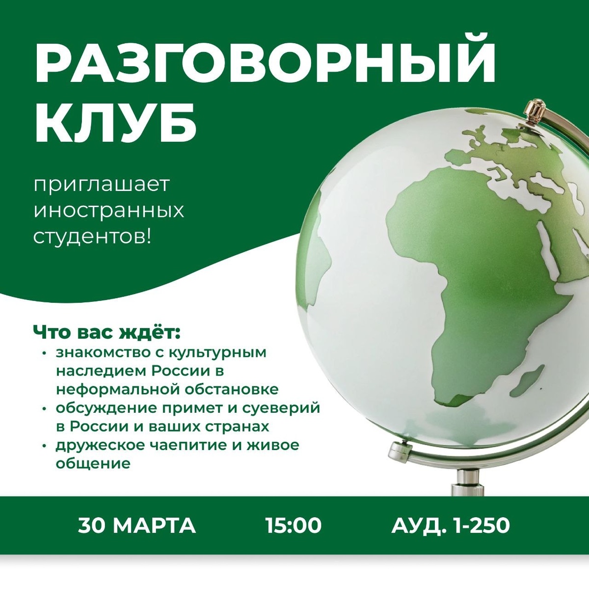 ! Друзья, приглашаем слушателей подготовительного отделения и всех иностранных студентов СПбГЛТУ на встречу в Разговорном клубе. Что вас ждёт: ▸ знакомство с культурным наследием России в неформальной обстановке ▸ обсуждение примет и суеверий в России и ваших странах ▸ дружеское чаепитие и живое общение 🗓 Когда: 30 марта, 15:00 📍 Где: аудитория 1-250 Будем рады видеть всех желающих! 💚 #СПбГЛТУ #СПбГЛТУ_анонс 👻 МАХ | 📲 ВК | 📝 ДЗЕН