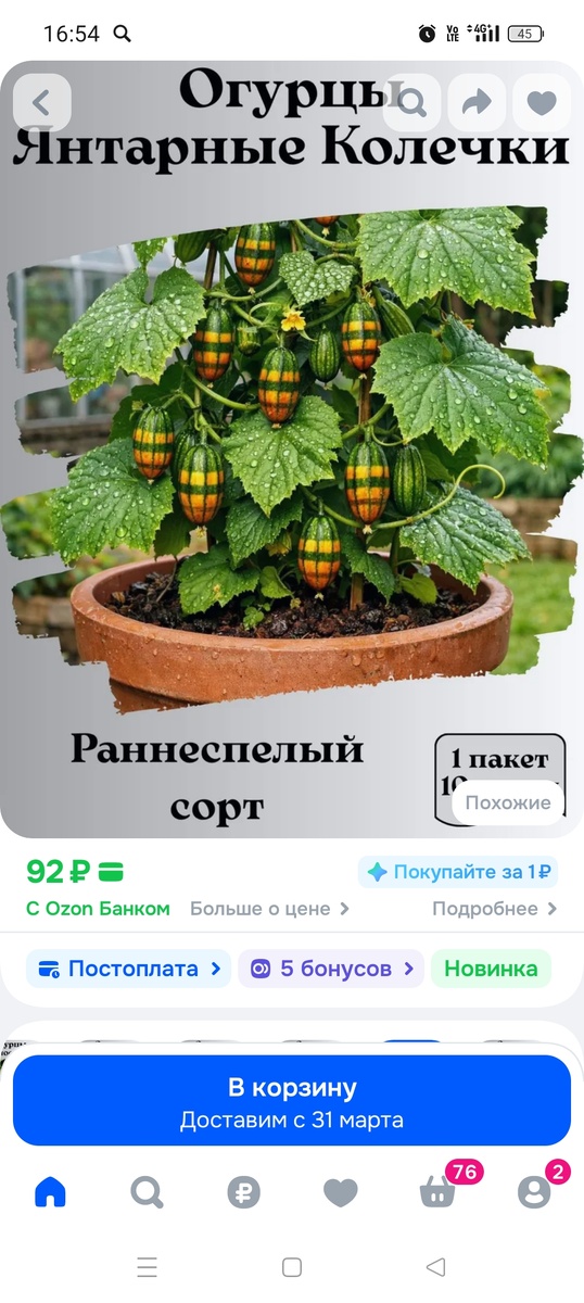 Обратите внимание - вкус ОГУРЦА сладкий! И так всё расписано - и длина в развёрнутом виде и диаметр и урожайность, что даже у опытного дачника закрадывается мысль - "А вдруг он действительно существует, этот удивительный огурец?" Ведь мы так любим всё новое, всё интересное. И отзывы все 5 звёзд, за то, что товар получили. Единственная четвёрка - нет картинки на упаковке.