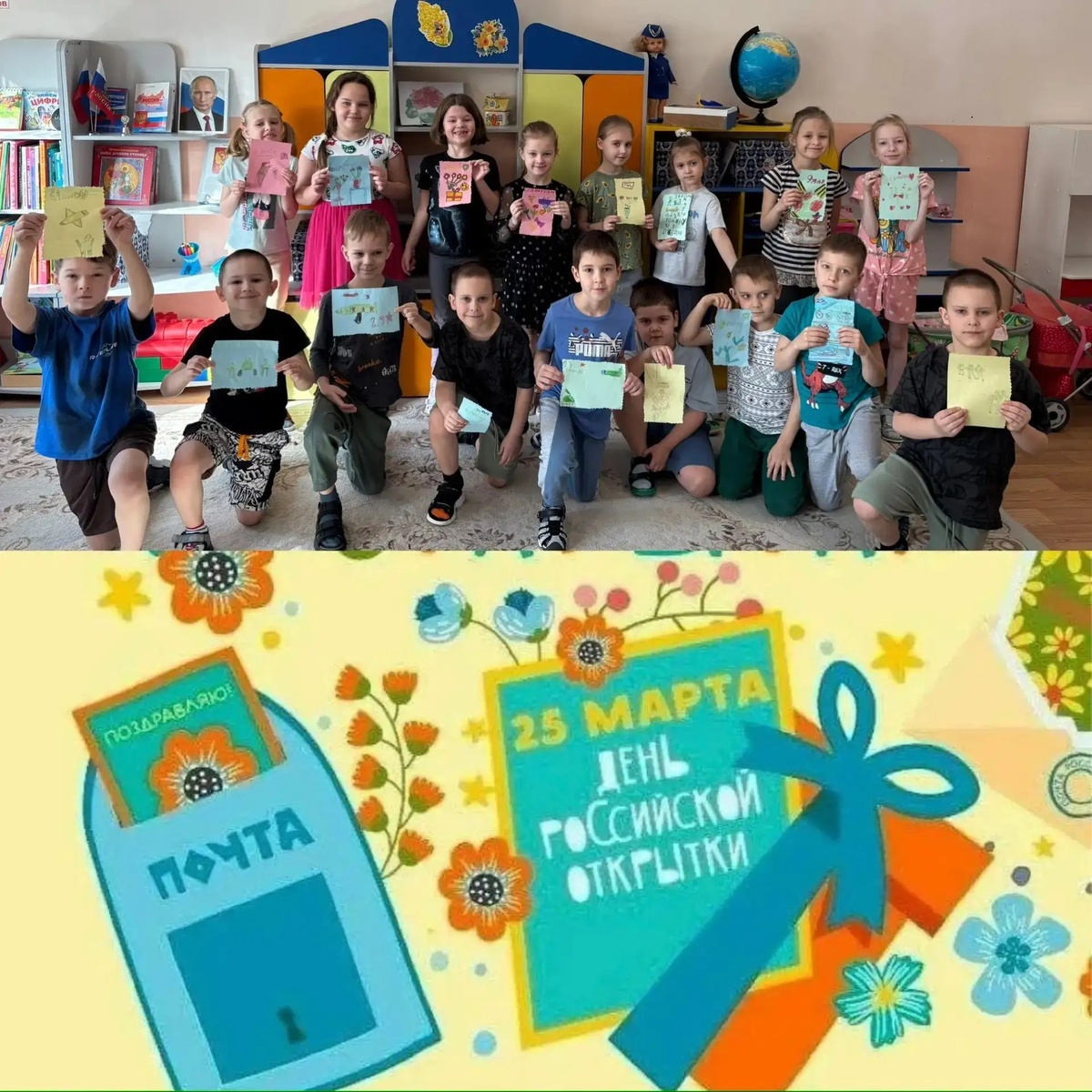 В День рождения почтовой открытки - 25 марта, ребята группы " Знайка" рассмотрели открытки разной тематики: 1 мая, 8 марта, новогодние