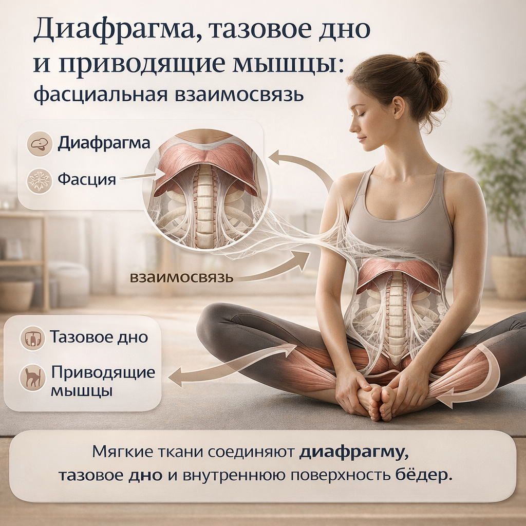 Представьте себе трехслойную систему, где каждый слой связан с другими невидимыми, но прочными нитями. Это не метафора, а реальная анатомическая реальность: ваша диафрагма (верхний слой), тазовое дно (нижний слой) и приводящие мышцы бедер (связующее звено) соединены в единую функциональную цепь через фасцию - плотную соединительную ткань, пронизывающую всё тело