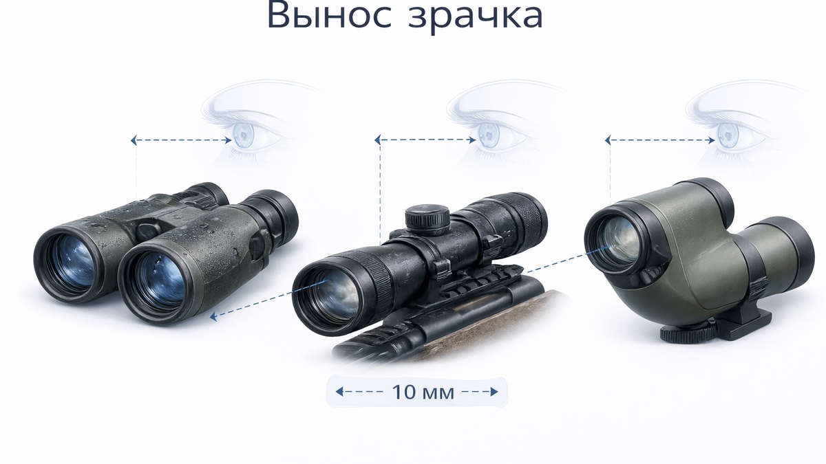 Вынос зрачка (Eye Relief) — это расстояние от последней линзы окуляра до точки, в которой глаз наблюдателя должен находиться, чтобы видеть полное поле зрения прибора. Измеряется в миллиметрах.