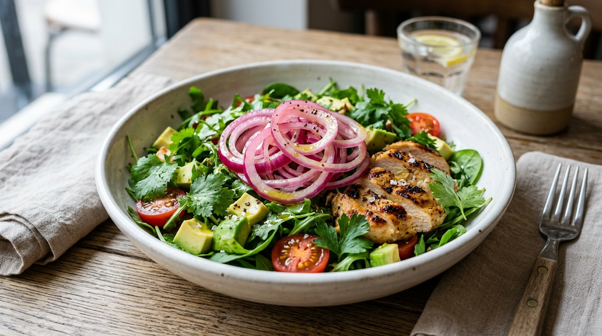 Салат получается невероятным. Нежная курица, кремовый авокадо, сочные помидорки, ароматная зелень — и лук, который связывает всё воедино своей мягкой пикантностью и приятной кислинкой. Никакой горечи, никакого дискомфорта. Даже мой младший, который обычно выковыривает лук из любого блюда, ест этот салат с удовольствием и просит добавки.
