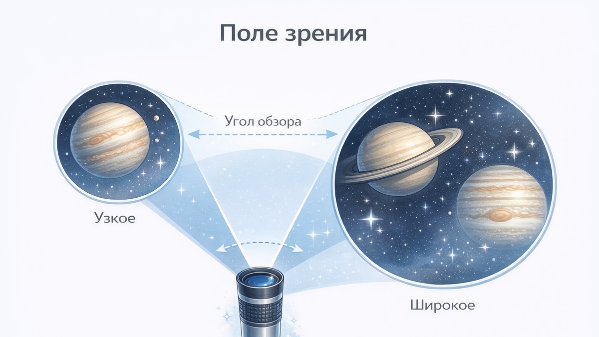 Поле зрения (Field of View, FoV) — это угол или ширина видимого пространства, которое наблюдатель видит через оптический прибор в один момент времени. Обозначается в угловых градусах (угловое поле зрения) или как ширина наблюдаемого пространства на определённой дистанции (линейное поле зрения). Угловое поле зрения — это угол в градусах, который охватывает прибор. Например, 7° означает, что наблюдатель видит сектор шириной 7 градусов. Линейное поле зрения — ширина видимого пространства на расстоянии 1000 м. Для перевода: линейное поле (м/1000 м) ≈ угловое поле (°) × 17,5. Например, поле 7° = примерно 122 м/1000 м. Для бинокля поле зрения — один из ключевых параметров выбора. Широкое поле зрения (8° и более) облегчает слежение за быстродвижущимися объектами — птицами, животными, спортивными соревнованиями. Узкое поле (4–5°) типично для высокократных биноклей. Зависимость: чем выше увеличение, тем у́же поле зрения. Бинокль 8×42 обычно имеет поле 8–9°, бинокль 12×50 — всего 5–6°. Это одна