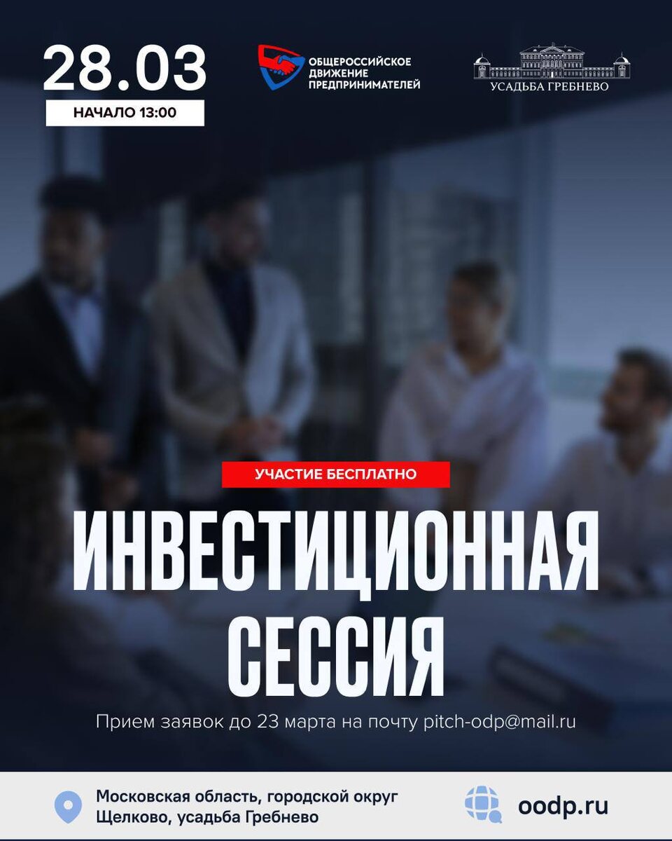 Мероприятие предоставит возможность компаниям, заинтересованным в привлечении инвестиций, презентовать проекты перед широкой аудиторией, получить квалифицированную обратную связь от инвесторов и экспертов, обменяться опытом с коллегами, привлечь инвесторов, партнеров и единомышленников для дальнейшего развития проекта! Для участия в питч-сессии необходимо прислать проект в формате.pdf на почту: pitch-odp@mail.ru ВХОД СВОБОДНЫЙ Адрес: Московская область, городской округ Щелково, усадьба Гребнево, зал «Каретный двор». А в 14:00 вас ждет бесплатная экскурсия по усадьбе Гребнево. Сбор гостей возле Администрации. И в 16:00 состоится моя бизнес-встреча. Вход свободный! ✅ АНДРЕЙ КОВАЛЕВ | reformator.ru | oodp.ru