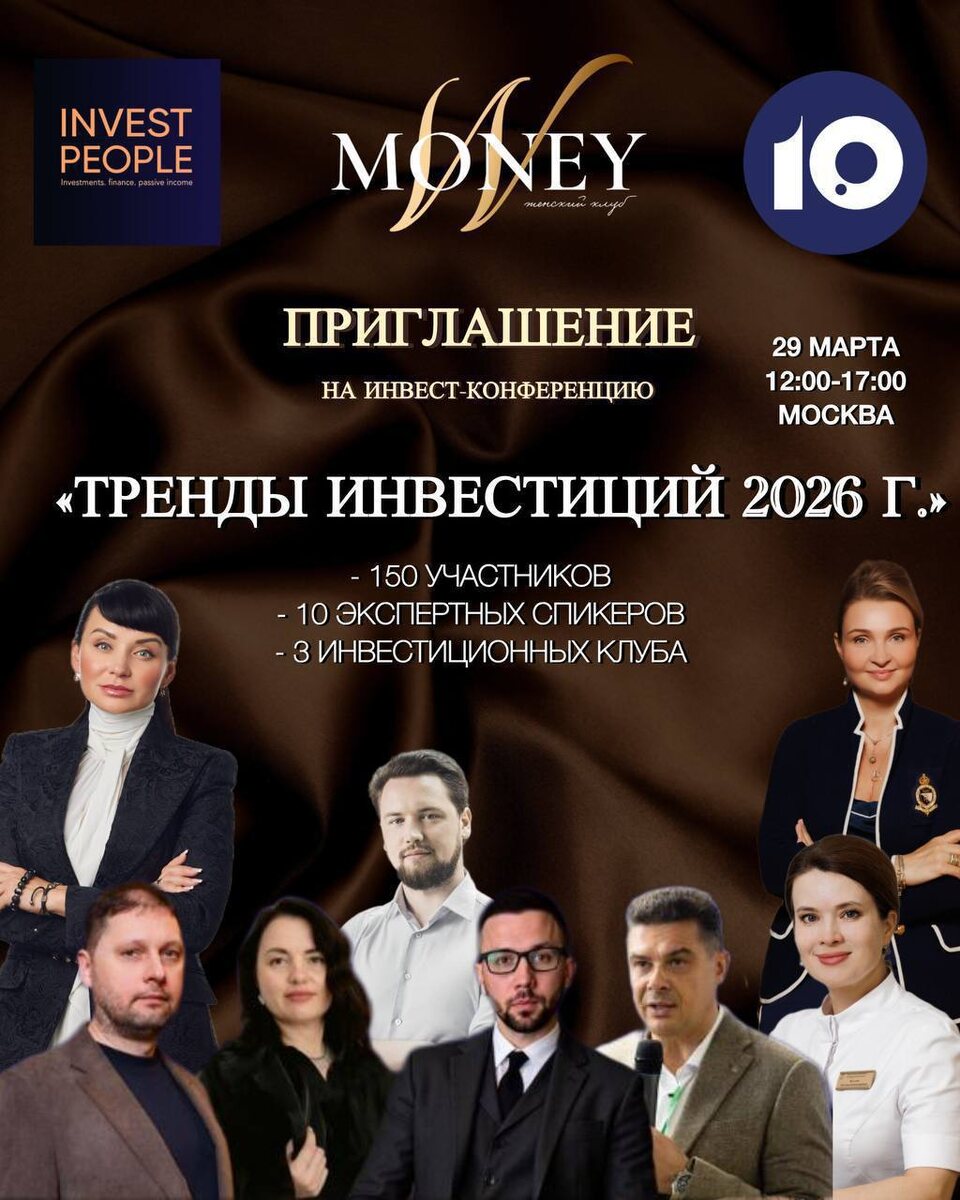 ЕСЛИ ВЫ ХОТИТЕ ВЫСТРОИТЬ СВОЮ ЛИЧНУЮ ИНВЕСТ СТРАТЕГИЮ , организовать пассивный доход 💰 И НАЙТИ РЕАЛЬНЫЕ ПРОЕКТЫ С ДОХОДНОСТЬЮ ОТ 25%, то 🤗🤗🤗 ПРИГЛАШАЮ ВАС НА БОЛЬШУЮ ИНВЕСТ-КОНФЕРЕНЦИЮ «ТРЕНДЫ ИНВЕСТИЦИЙ 2026» “WOMAN MONEY Club” совместно с мужскими инвестиционными клубами «INVEST PEOPLE» и «КРУГ 10» 📌29 марта 12:00-17:00 📌ресторан «НЕ ЗА ГОРАМИ» 📌Регистрация обязательна : - 150 участников - 10 экспертных спикеров - 3 инвестиционных клуба 📣Максим Дзекунов: Как инвестировать в твёрдый актив на берегу моря от 1 000 000 ₽ с доходностью до 38% годовых 📣Алексей Ушаев: 📌Как сильное окружение влияет на рост капитала в инвестициях 📣 Иван Тягунов 📌Портфельные инвестиции в недвижимость с порогом входа от 100 000 ₽ 📌«Инвестиции в здоровье! Кремлевское долголетие » 📣Светлана Вешнева ▫️Главный врач клинического санатория "Барвиха" Управления делами Президента РФ ,К.м.н. 📌 «Стратегии инвестора на рынке недвижимости» 📣 Виктор Зубик ▫️основатель Smarent ▫️YouTube-канал
