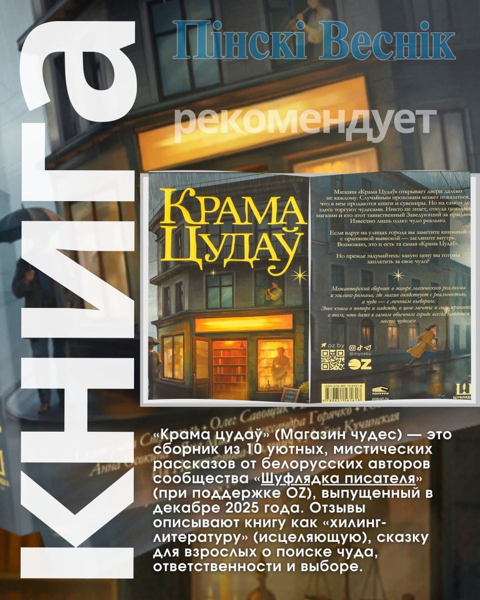 ➡️Сборник из 10 уютных мистических рассказов от белорусских авторов сообщества «Шуфлядка писателя» вышел в декабре 2025 года при поддержке OZ. Читатели уже называют его «хилинг-литературой» – книгой, которая исцеляет и согревает. О чём книга? ➡️Связующее звено – таинственный магазин и его загадочный хозяин – Заведующий. Герои приходят сюда за чудом, но находят нечто большее: ответы на важные вопросы, возможность заглянуть в себя и сделать внутренний выбор. Почему стоит прочитать? ✨ Атмосфера: уютные, добрые истории для зимних вечеров ✨ Жанр: городское фэнтези, душевные рассказы ✨ Глубина: о том, что настоящие чудеса творят сами люди «Крама цудаў» – для тех, кто хочет поверить в сказку, любит атмосферное чтение и ищет ответы на жизненные вопросы в мистическом контексте. @Пинский Вестник 📱Ютуб 📱ВК 📱ИНСТАГРАМ 📱ОК 📱ФЕЙСБУК 📱ТИК ТОК Прислать новость