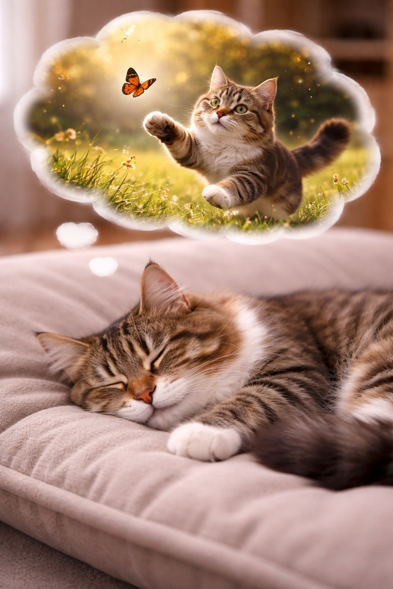 Кошка спит. Спокойно лежит. И вдруг - лапы начинают дёргаться. Усы шевелятся. Иногда она тихо "мяукает" или издаёт странные звуки. И создаётся ощущение: будто ей что-то снится. И возникает вопрос: Она правда видит сны - или это просто случайные движения? Это выглядит слишком "настоящим", чтобы быть случайностью Иногда движения похожи на бег. Иногда - на охоту. Бывает, кошка резко просыпается, как будто только что откуда-то "вернулась". И всё это выглядит слишком осмысленно. Как будто в её голове действительно происходит что-то важное. У кошек действительно есть фазы сна И именно здесь начинается самое интересное. Сон у кошек, как и у людей, делится на несколько фаз. Есть глубокий сон. А есть фаза быстрого сна - так называемая REM-фаза. Именно в этот момент: активно работает мозг двигаются глаза под веками появляются сновидения Да, у кошек они тоже есть. Почему кошка "двигается" во сне В фазе REM мозг остаётся активным. Он не отдыхает - он обрабатывает информацию. Переживает события.