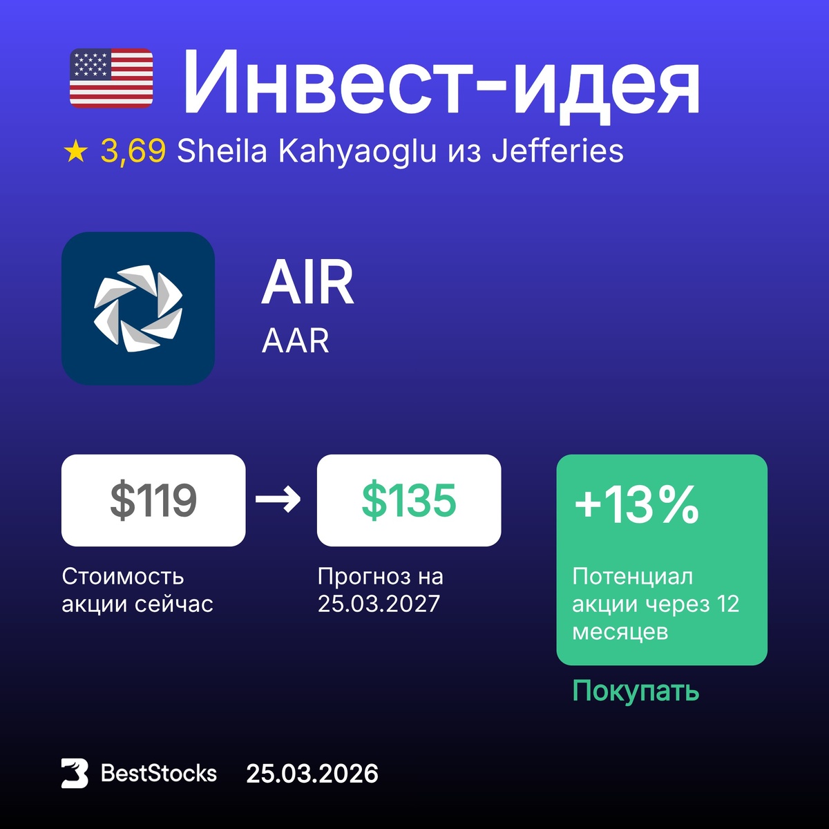 Π’ΠΈΠΊΠ΅Ρ: AIR ΠΡΠΎΠ³Π½ΠΎΠ·Π½Π°Ρ ΡΠ΅Π½Π°: $135 (+13%) Π Π΅ΠΊΠΎΠΌΠ΅Π½Π΄Π°ΡΠΈΡ: ΠΠΎΠΊΡΠΏΠ°ΡΡ InvestRank Π°ΠΊΡΠΈΠΈ: 9 ΠΈΠ· 10 ΠΡΠΎΠ³Π½ΠΎΠ· ΡΠ΄Π΅Π»Π°Π½: 25.03.2026 ΠΡΠΎΠ³Π½ΠΎΠ· Π΄ΠΎ: 25.03.2027 ΠΠ½Π²Π΅ΡΡ-ΠΊΠΎΠΌΠΏΠ°Π½ΠΈΡ: Jefferies ΠΠ½Π°Π»ΠΈΡΠΈΠΊ: Sheila Kahyaoglu ΠΡΡ ΡΠ΅ΠΊΠΎΠΌΠ΅Π½Π΄Π°ΡΠΈΠΈ Π½Π° ΡΠ΅Π³ΠΎΠ΄Π½Ρ β β’β’β’β’β’ β ΠΡΠΎΠΊΠ΅Ρ ΠΏΠ΅ΡΠ΅ΡΡΠ°Π» ΠΏΠΎΠΊΠ°Π·ΡΠ²Π°ΡΡ ΡΡΠΎΠΈΠΌΠΎΡΡΡ ΠΏΠΎΡΡΡΠ΅Π»Ρ? ΠΡΠΎ ΠΌΠΎΠΆΠ½ΠΎ ΠΈΡΠΏΡΠ°Π²ΠΈΡΡ β BestStocks ΡΠ΄Π΅Π»Π°Π» ΡΠΏΠ΅ΡΠΈΠ°Π»ΡΠ½ΡΠΉ Π±Π΅ΡΠΏΠ»Π°ΡΠ½ΡΠΉ ΠΈΠ½ΡΡΡΡΠΌΠ΅Π½Ρ, ΠΊΠΎΡΠΎΡΡΠΉ ΠΏΠΎΠΊΠ°Π·ΡΠ²Π°Π΅Ρ ΡΡΠΎΠΈΠΌΠΎΡΡΡ Π²ΡΠ΅Ρ