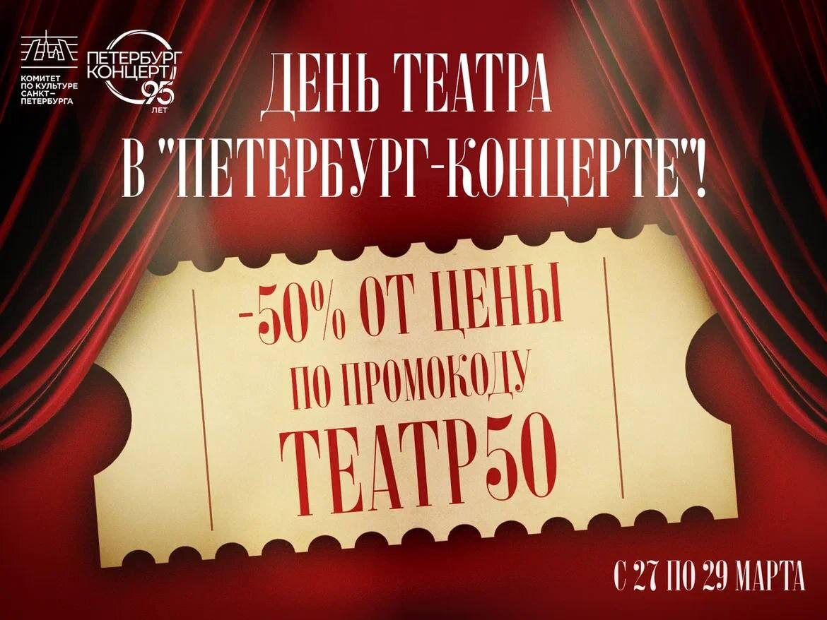 ! В честь праздника мы дарим вам возможность посетить наши события* по специальной цене — минус 50%! Воспользоваться промокодом ТЕАТР50 можно с 00:00 27 марта до 23:59 29 марта 2026 года. Промокод действует при покупке билетов на официальном сайте «Петербург-концерта» и в кассах Дома Кочневой и Екатерининского собрания. Наличие билетов уточняйте на сайте (по ссылке в описании профиля) или по телефону: +7(812) 779 10 92. *Промокод не действует на: абонементы; выставки; концерт «Русские сцены»; «Фарух Рузиматов. Вечер стариной и современной хореографии», концерт «Легенды севера. Национальный ансамбль Карелии "Кантеле"», мюзикл «Громче правил!», концерт «Антон Авдеев и Эстрадно-симфонический оркестр Санкт-Петербурга»