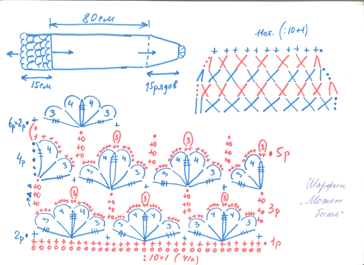 Свяжите кружево по схеме. От начальной цепочки кружева вяжите основное полотно. Затем вяжите с убавками пятнадцать рядов, до одиннадцати столбиков. И закончите шарфик одним кружевным фрагментом.