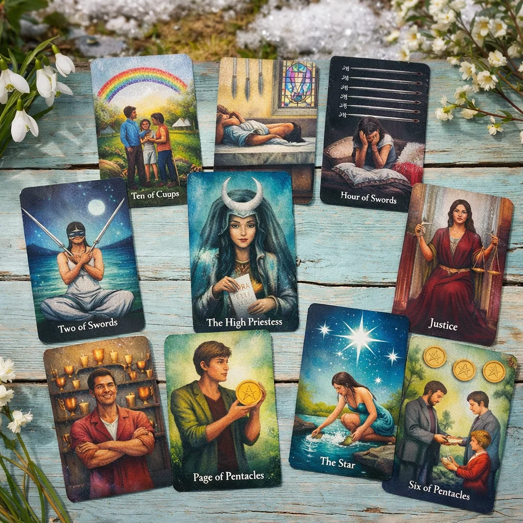 ✨Спасибо, что вы здесь, в этом уютном пространстве магии и вдохновения! 📥 Запись на личные расклады: MAX/WhatsApp/Telegram: +7 995 494 50 11 Мои хорошие, сегодня у нас не просто расклад. Здесь прямое вмешательство, и если вы это смотрите — значит, вас не просто ведут, вас буквально выводят из-под удара. Перед тем, как мы перейдем к нашему раскладу, хочу сделать небольшое объявление. Обязательно подписывайтесь на канал «Семён и Маргарита | Проводники знаков» — там идут более глубокие и точные послания, которые реально попадают в суть. А теперь к сути… Карты здесь тяжёлые и сильные одновременно: Десятка Кубков, Четвёрка Мечей, Девятка Мечей, Двойка Мечей, Верховная Жрица, Правосудие, Звезда, Туз Мечей, Колесо Фортуны… и первое, что они говорят — вы не случайно проходили через боль. Вас как будто держали в паузе, не давая двигаться туда, куда вы сами рвались. И вот здесь самое важное: вас остановили не потому, что у вас не получилось, а потому что дальше шёл сценарий разрушения. Я прям