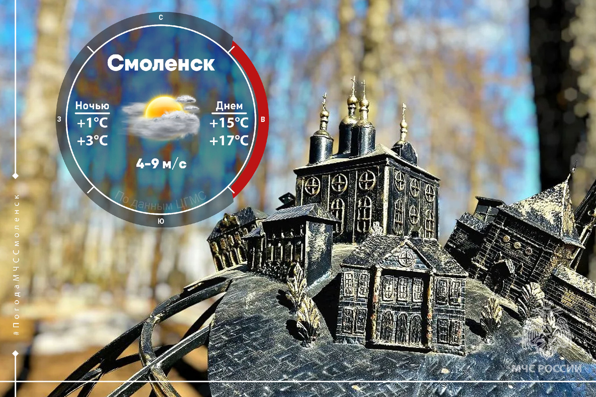 - в Смоленске: ночью +1°С …+3°С, днём +15°С …+17°С. Теплый приятный ветер восточный четверти будет дуть со скоростью 4-9 м/с. Атмосферное давление 736 мм рт. столба, в течение суток будет слабо расти. Все изменения в погоде смотри по ссылке: meteoinfo.ru/hdmapsmete... МЧС России напоминает: