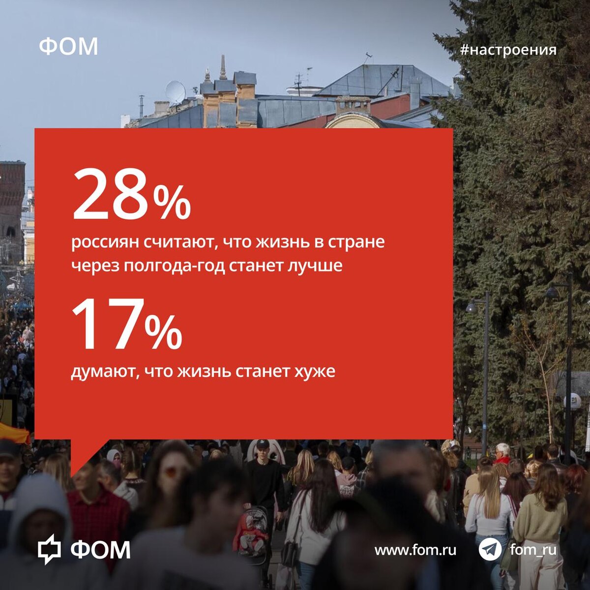 По мнению 28% россиян, через полгода-год жизнь в стране станет лучше. 17% считают, что хуже, 35% не ждут изменений. Через 3-5 лет улучшения прогнозируют 34% опрошенных, ухудшения – 17%, а 23% думают, что ничего не изменится. В жизни своей семьи в краткосрочной перспективе (полгода-год) улучшения ждут 38% респондентов, ухудшения – 8%, 35% считают, что ничего не поменяется. В долгосрочной перспективе (3-5 лет) улучшения ожидают 42% участников опроса, ухудшения – 9%, а 25% полагают, что значительных изменений не будет. Подробнее: fom.ru #настроения #экономика #семья 📱 Фонд Общественное Мнение