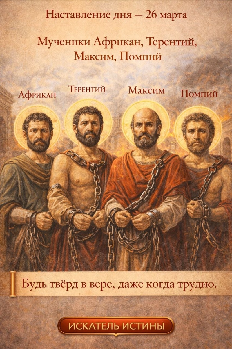 Мученики Африкан, Терентий, Максим, Помпий В этот день Церковь вспоминает святых мучеников, которые пострадали за исповедание Христа и не отреклись от веры перед лицом угроз и страданий. Они жили в условиях, когда вера требовала открытого выбора. Нельзя было оставаться в стороне или скрываться — нужно было либо остаться с Христом, либо отказаться от Него. Святые мученики показали, что истинная вера не меняется под давлением обстоятельств. Она не зависит от внешней безопасности или удобства. Их подвиг — это не только мужество перед страданием, но и внутренняя решимость. Они не стали оправдывать слабость, не искали компромисса, а остались верными до конца. Сегодня это напоминание о том, что в жизни тоже бывают моменты выбора — пусть не столь явные, но не менее значимые. И в этих ситуациях важно не идти против совести. Верность Богу проявляется в малых решениях — в правде, честности и отказе от того, что противоречит истине.