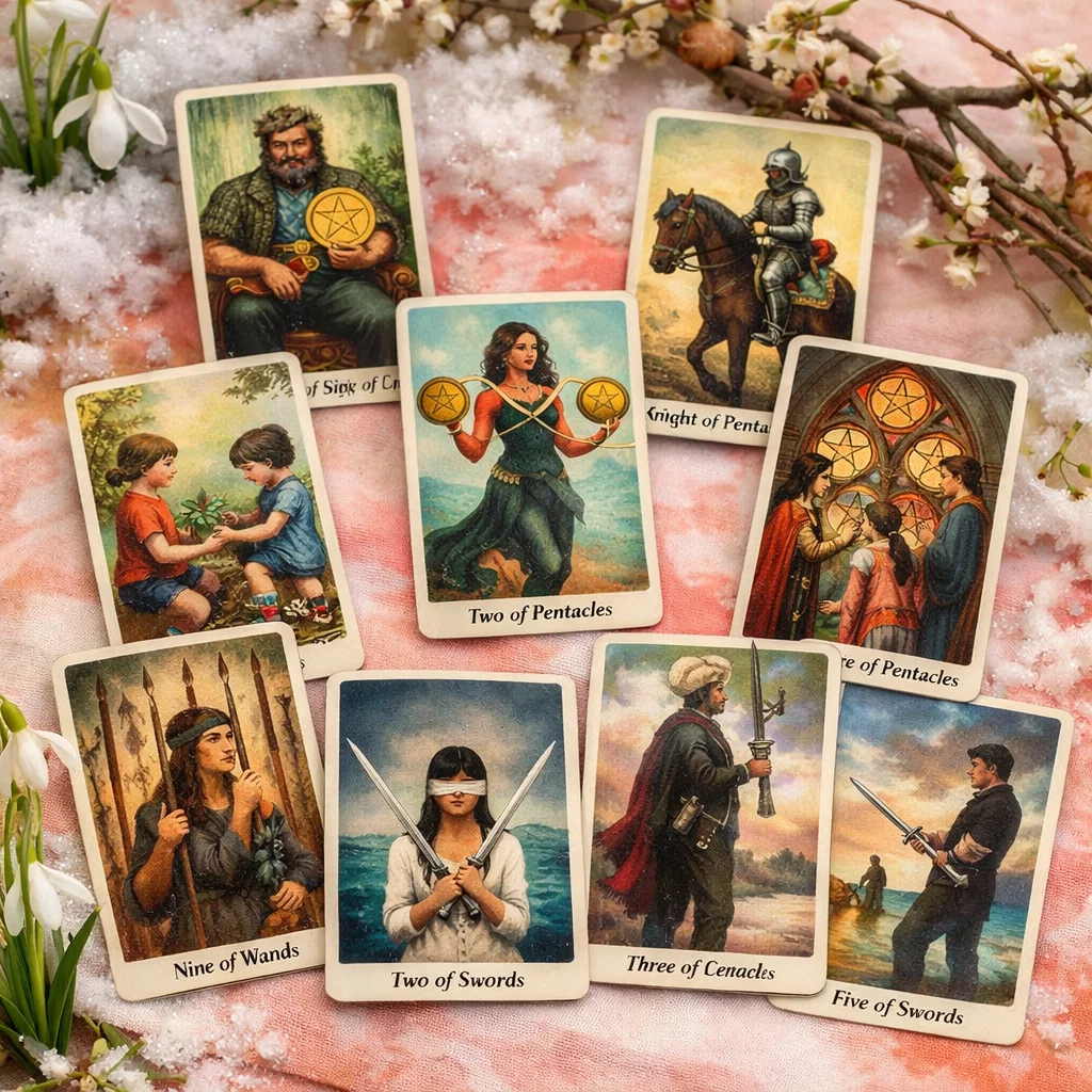 Сразу в раскладе проявляется очень характерная энергия — Король Пентаклей вместе с Рыцарем Пентаклей. Это мужчина, который не любит спешить, он может казаться медленным, даже заторможенным в действиях, но внутри у него идёт серьёзный процесс. Он не из тех, кто бросается в омут с головой, он сначала сто раз подумает, всё взвесит, оценит риски и только потом сделает шаг. Сейчас его жизнь будто немного на паузе — какие-то дела зависли, планы не реализуются так быстро, как хотелось бы, и это тоже влияет на его состояние.