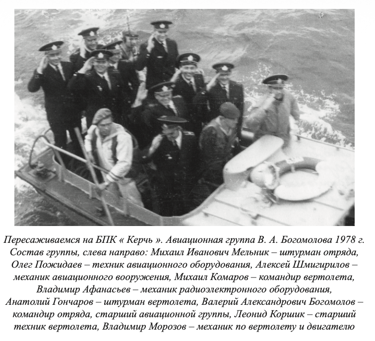 На Средиземное море прибыли попутным военным судном из Севастополя. Меняли авиационную группу Геннадия Колякова. На фото – взяли под козырек, подходим на баркасе к трапу. Группу встречал командир большого противолодочного корабля «Керчь», друг Богомолова, Юрий Германович Гусев.