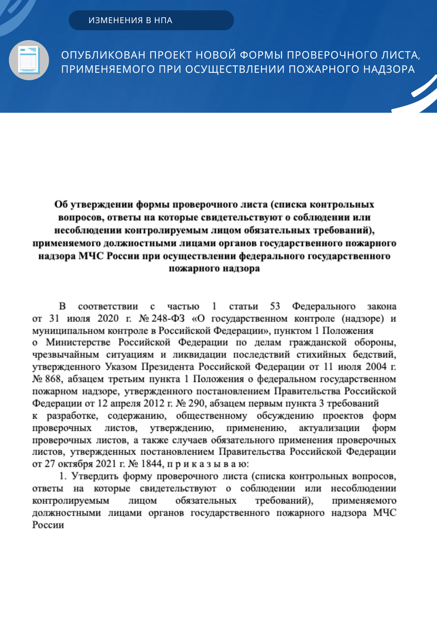 Опубликован проект новой формы проверочного листа, применяемого при осуществлении пожарного надзора