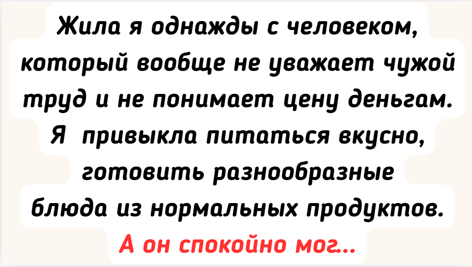 - Жила я однажды с человеком, который вообще не уважает чужой труд и не понимает цену деньгам. Я привыкла питаться вкусно, готовить разнообразные блюда из нормальных продуктов. А он спокойно мог неделями есть дешевые макароны с сосисками, как будто их сделали из туалетной бумаги, и заедать жареной картошкой. Я готовлю хорошо и обычно делаю сразу на несколько дней, но я медлительная, поэтому на готовку у меня уходит весь день. Обычно это суп или борщ или солянка, плюс два-три вторых блюда, плюс разные салаты. Сожитель всегда брал обед на работу и еще что-то перекусить, потому что утром он не завтракал. Однажды у нас был какой-то праздник, и к нам пришли его коллеги. И один прямо с порога выдал: «Ммм, обожаю твою еду, давай быстрее к столу!» А я его впервые вижу и точно никогда не кормила. В процессе разговора выяснилось, что мой благоверный на работе менялся обедами! То есть я ему готовлю солянку, где три вида мяса и нормальная дорогая колбаса с хорошим составом. Бутерброды делаю не с дешевым сырком, а с маасдамом. А этот идиот менял это на чью-то жареную картошку! Когда все разошлись, я сказала, что из дома он больше не вынесет даже гречку, приготовленную мной. Я один из двух выходных полностью тратила на готовку, чтобы этот болван кормил чужих мужиков!