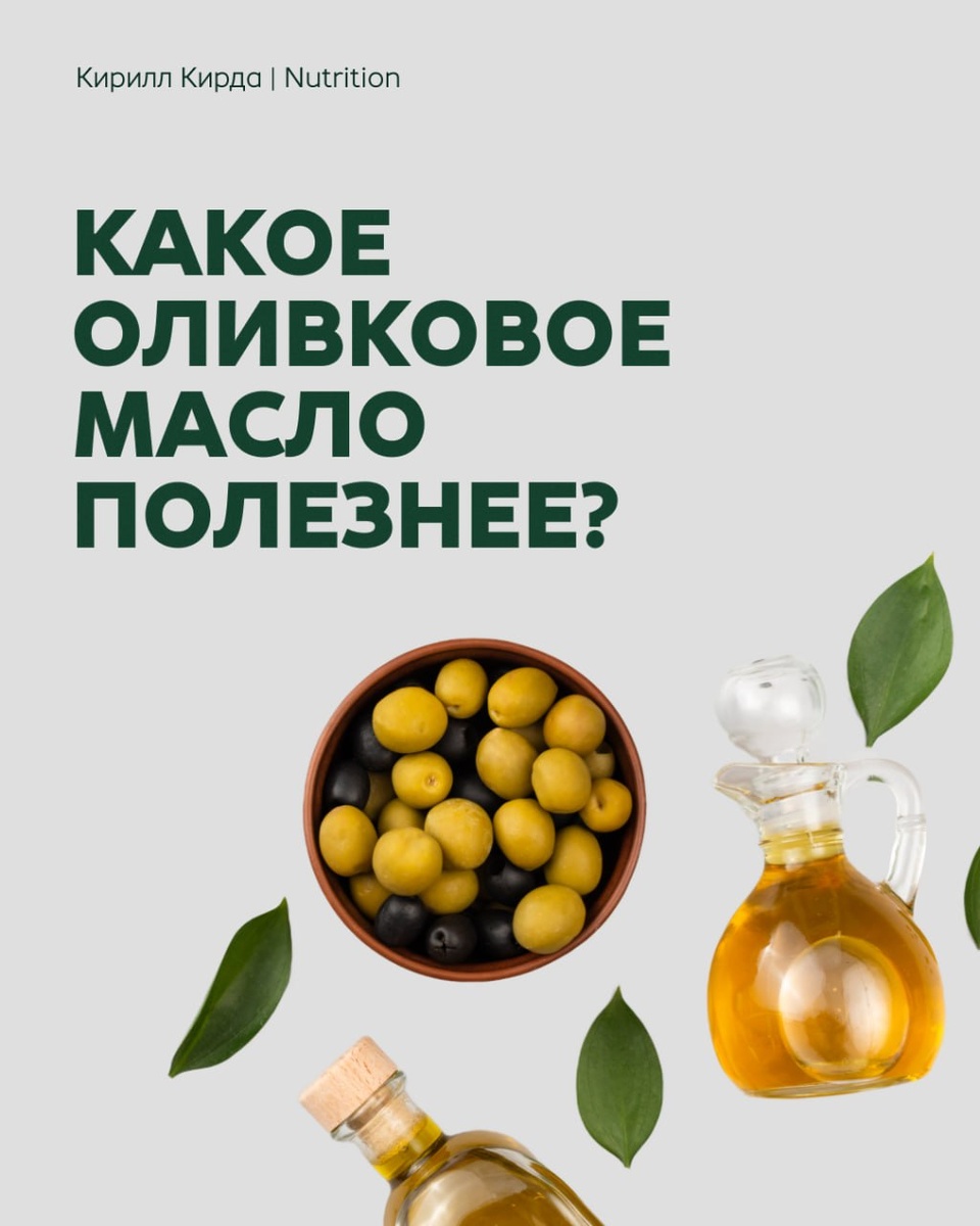 ? Если коротко: по пользе выигрывает нерафинированное, особенно extra virgin. Но есть нюанс: рафинированное не “плохое” и не “пустое”, как многие думают. Разбираемся! В чем их разница? Нерафинированное масло проходит минимальную обработку и сохраняет больше биологически активных веществ, в том числе полифенолов. Именно за счет них extra virgin ценят не только как источник жиров, но и как более интересный вариант с точки зрения пользы. Рафинированное масло очищают сильнее. Из-за этого оно теряет часть вкуса, аромата и полезных соединений, но жирнокислотный профиль у него все равно остается достойным. То есть это не “мертвое масло”, а просто более бедный вариант по составу. Теперь важный миф Многие до сих пор спорят на счет того, можно ли нагревать оливковое масло. Кто-то говорит, что можно только рафинированное, кто-то говорит, что можно оба, а кто-то вообще старается на нем не жарить. Так вот, запрет на готовку с ним - это миф. Оливковое масло в целом достаточно стабильно к высоким