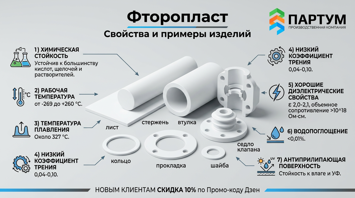 Фторопласт-4 выбирают не потому, что это просто известный материал. Его берут там, где в одной детали нужны сразу химическая стойкость, стабильная работа при температуре, низкое трение и хорошая электроизоляция. Поэтому в ООО "Партум" мы держим фторопласт в наличии, а если нужна не заготовка, а готовое изделие, можем изготовить деталь по индивидуальным чертежам. А по промо-коду "Дзен" для новых клиентов действует скидка 10% на первый заказ.