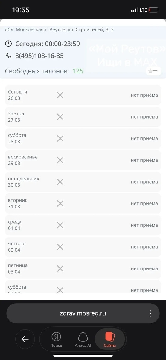😳 До этой даты нет приема🙃 Это что за режим работы такой? А что делать, если нужно срочно? Идти по платному? Зачем тогда мы платим налоги, если вся медицина платная, либо нет приема, либо запись через две недели только? Все для людей🤦♀️ #отподписчиков #Реутов #здравоохранение #минздрав «Мой Реутов» в MAX: https://max.ru/reutov_today