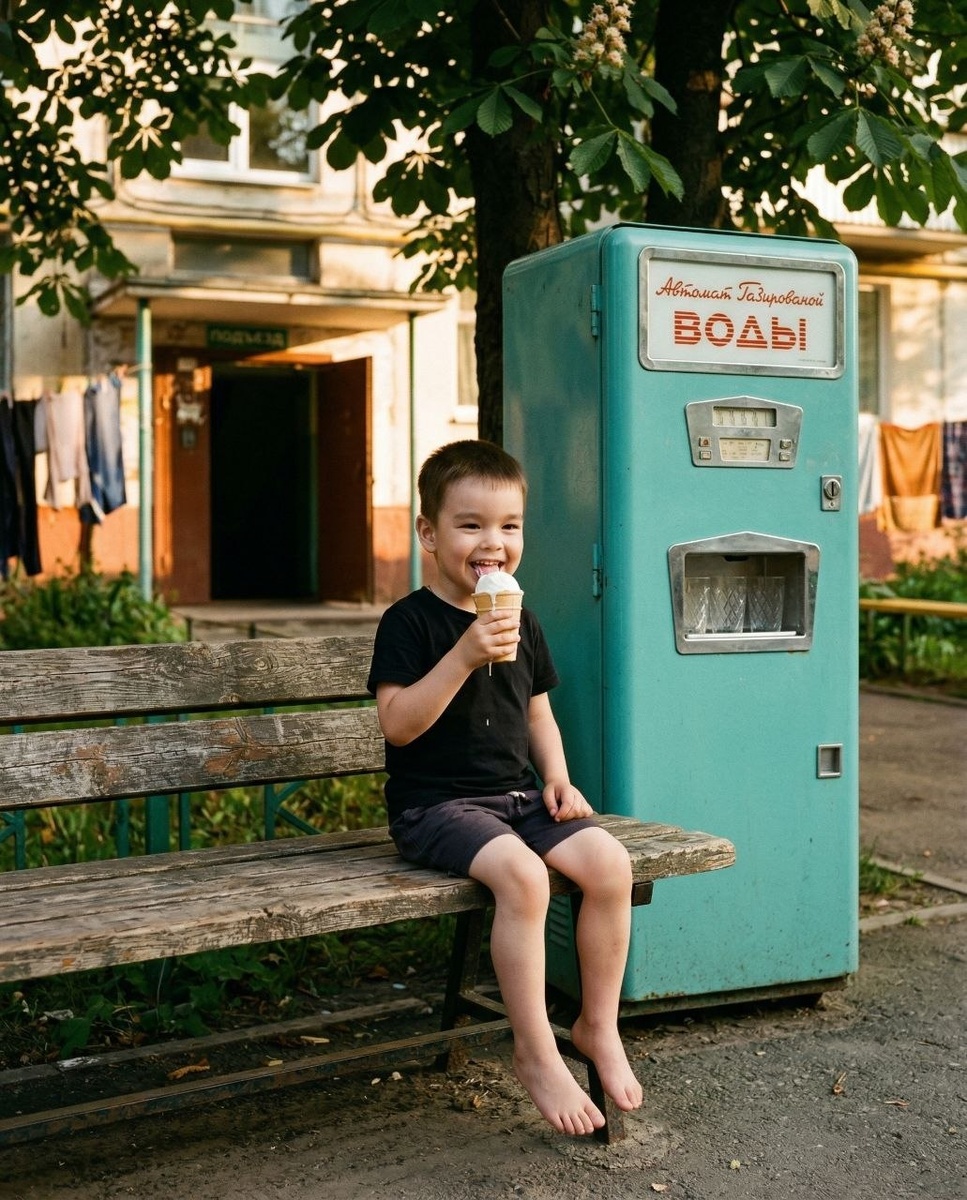 От подписчика @Lav_Inna_7 Кинематографичный кадр, снятый на 35-мм пленку Kodachrome, 1975 год. Крупный план: детские руки держат подтаявший вафельный стаканчик пломбира, видна пористая текстура вафли и стекающая капля сливок. На заднем плане — размытый солнечный двор «хрущевки», босоногие дети бегают по теплому асфальту. В углу кадра стоит аутентичный советский автомат с газировкой бирюзового цвета, на подставке — мокрый граненый стакан с пузырьками воздуха. Естественное освещение «золотого часа», контровой свет пробивается сквозь листву тополей, в лучах видны парящие пылинки. Глубокая детализация кожи, тканей хлопка и текстуры старой краски. Атмосфера абсолютной безмятежности, безопасности и вечного лета. Высокая резкость, зернистость пленки, f/2.8, гиперреализм. Если тормозит Telegram, делаю в русском веб-сервисе gptunnel (промокод на скидку 75% PROMPT1_75 ) Если Telegram не тормозит делаю в Telegram боте Syntx Наша группа VK - если нет сил сидеть в ТГ. #лето@prompt1_ru #ссср@pr
