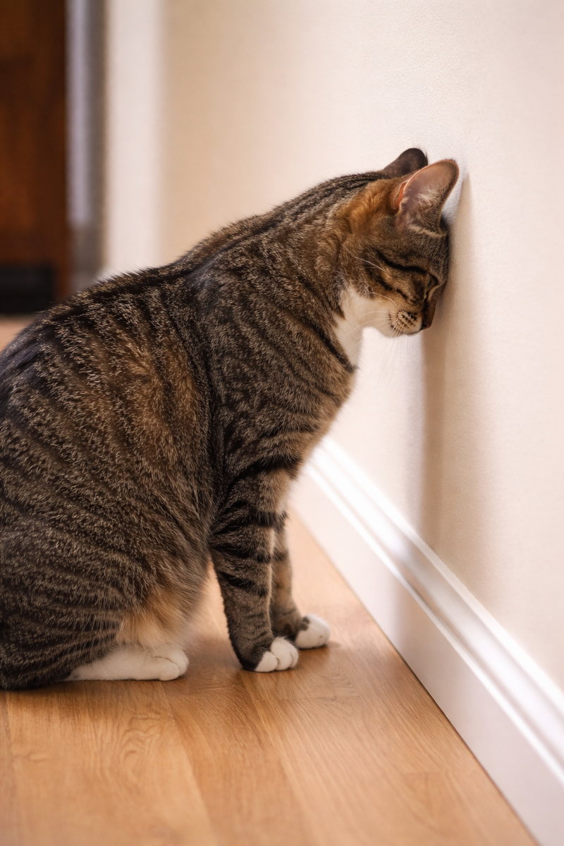 Кошка стоит и упирается лбом в стену. Это не странность, а тревожный сигнал